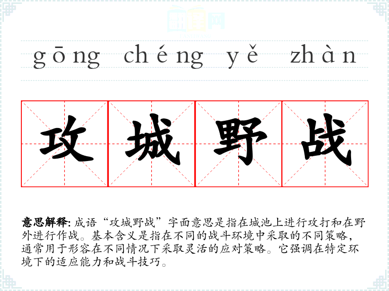 成语“攻城野战”字面意思是指在城池上进行攻打和在野外进行作战。基本含义是指在不同的战斗环境中采取的不同策略,通常用于形容在不同情况下采取灵活的应对策略。它强调在特定环境下的适应能力和战斗技巧。