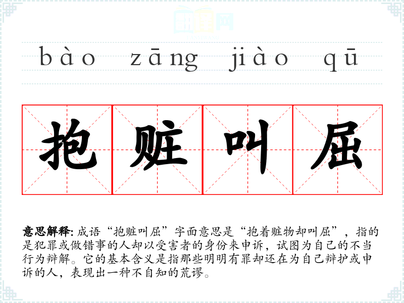 成语“抱赃叫屈”字面意思是“抱着赃物却叫屈”,指的是犯罪或做错事的人却以受害者的身份来申诉,试图为自己的不当行为辩解。它的基本含义是指那些明明有罪却还在为自己辩护或申诉的人,表现出一种不自知的荒谬。