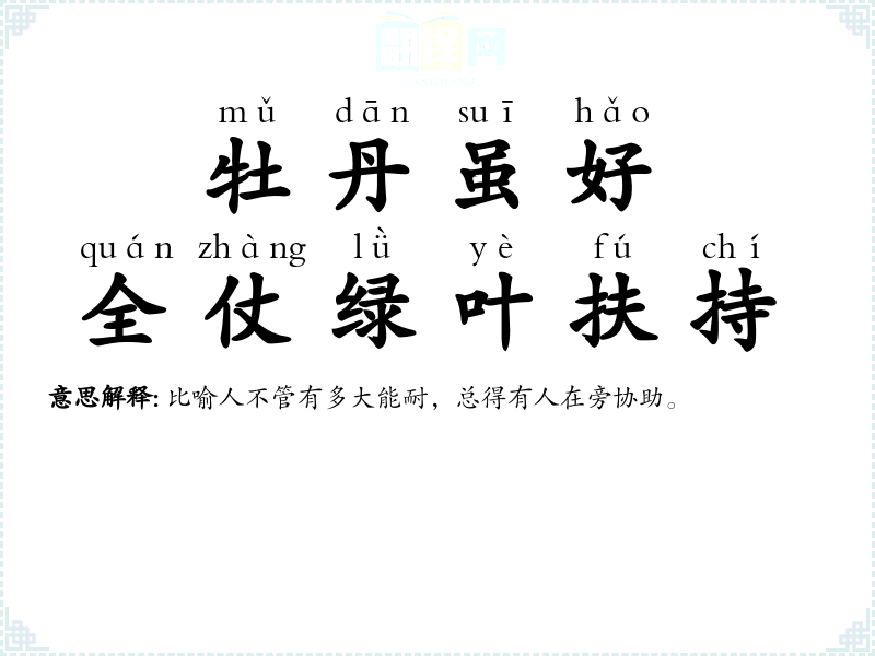 扶持:扶助。比喻再好的事物也要有个帮衬。 |