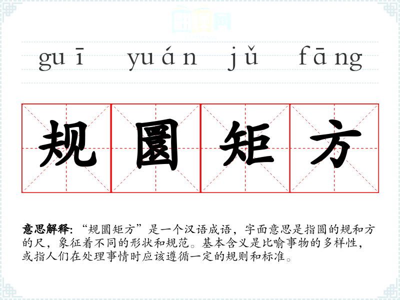 “规圜矩方”出自《周易》,原文中提到“天行健,君子以自强不息”,暗示人在生活和工作中应当遵循一定的原则和规则。这一成语反映了古代哲学思想,强调事物的多元性和规范性。