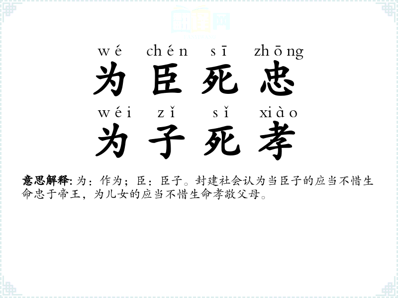 为:作为;臣:臣子。封建社会认为当臣子的应当不惜生命忠于帝王,为儿女的应当不惜生命孝敬父母。 |
