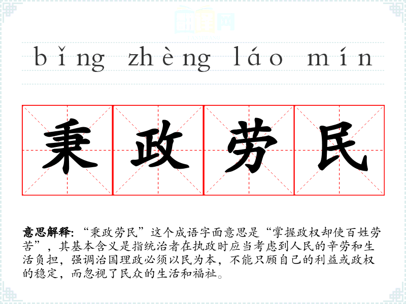 “秉政劳民”这个成语字面意思是“掌握政权却使百姓劳苦”,其基本含义是指统治者在执政时应当考虑到人民的辛劳和生活负担,强调治国理政必须以民为本,不能只顾自己的利益或政权的稳定,而忽视了民众的生活和福祉。