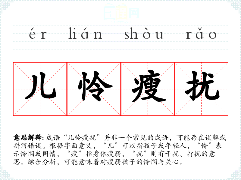 成语“儿怜瘦扰”并非一个常见的成语,可能存在误解或拼写错误。根据字面意义,“儿”可以指孩子或年轻人,“怜”表示怜悯或同情,“瘦”指身体瘦弱,“扰”则有干扰、打扰的意思。综合分析,可能意味着对瘦弱孩子的怜悯与关心。
