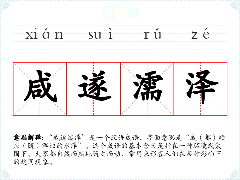 “咸遂濡泽”是一个汉语成语,字面意思是“咸(都)顺应(随)浑浊的水泽”。这个成语的基本含义是指在一种环境或氛围下,大家都自然而然地随之而动,常用来形容人们在某种影响下的趋同现象。