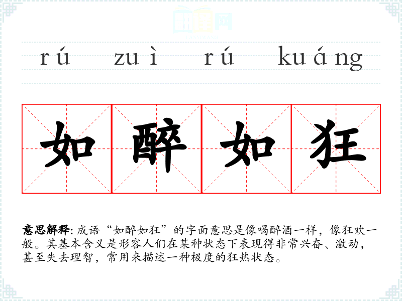 成语“如醉如狂”的字面意思是像喝醉酒一样,像狂欢一般。其基本含义是形容人们在某种状态下表现得非常兴奋、激动,甚至失去理智,常用来描述一种极度的狂热状态。