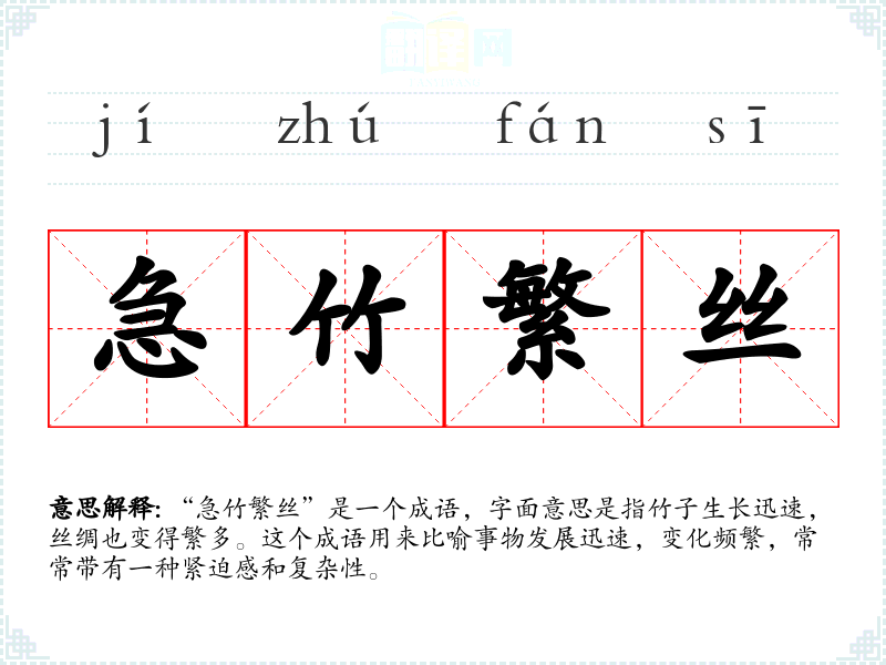 “急竹繁丝”是一个成语,字面意思是指竹子生长迅速,丝绸也变得繁多。这个成语用来比喻事物发展迅速,变化频繁,常常带有一种紧迫感和复杂性。