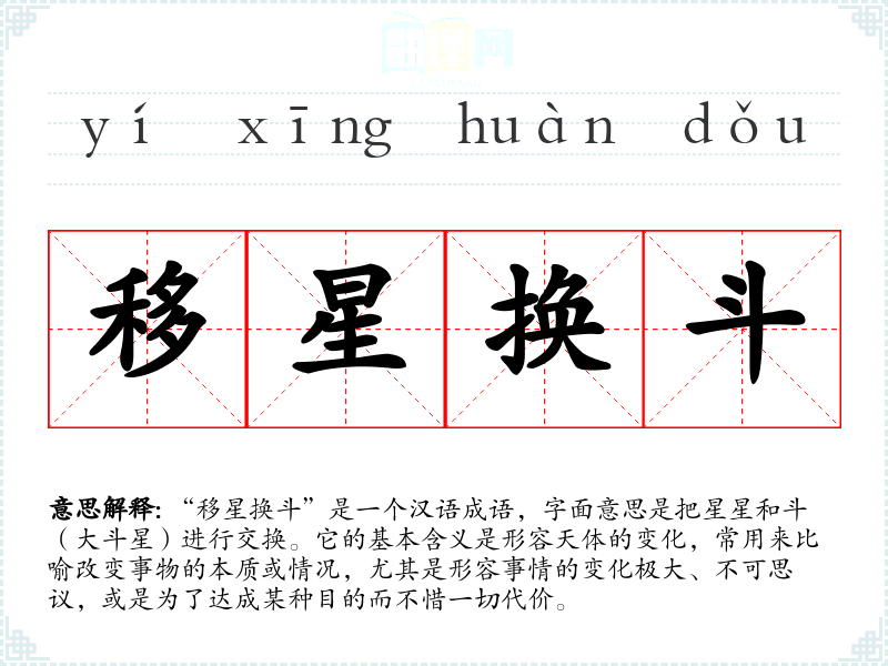 “移星换斗”是一个汉语成语,字面意思是把星星和斗(大斗星)进行交换。它的基本含义是形容天体的变化,常用来比喻改变事物的本质或情况,尤其是形容事情的变化极大、不可思议,或是为了达成某种目的而不惜一切代价。