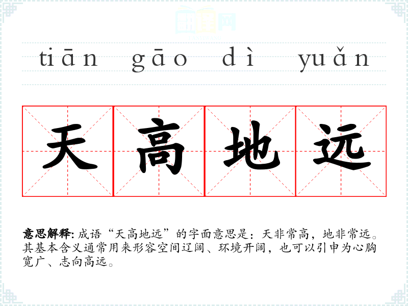 成语“天高地远”的字面意思是:天非常高,地非常远。其基本含义通常用来形容空间辽阔、环境开阔,也可以引申为心胸宽广、志向高远。