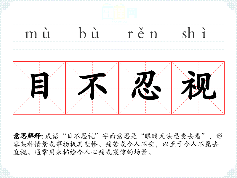 成语“目不忍视”字面意思是“眼睛无法忍受去看”,形容某种情景或事物极其悲惨、痛苦或令人不安,以至于令人不愿去直视。通常用来描绘令人心痛或震惊的场景。