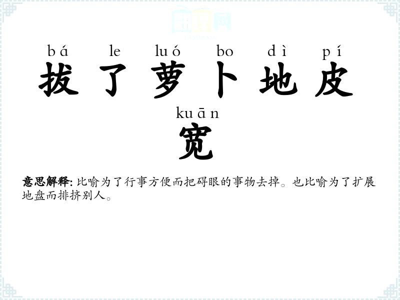 | 拔了萝卜地皮宽 | 比喻为了行事方便而把碍眼的事物去掉。也比喻为了扩展地盘而排挤别人。 |