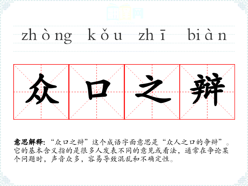“众口之辩”这个成语字面意思是“众人之口的争辩”。它的基本含义指的是很多人发表不同的意见或看法,通常在争论某个问题时,声音众多,容易导致混乱和不确定性。