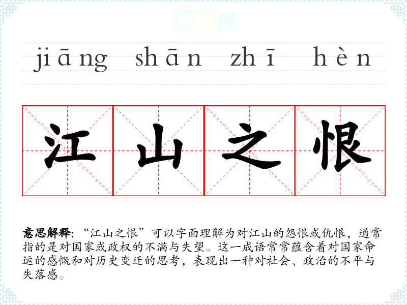 “江山之恨”可以字面理解为对江山的怨恨或仇恨,通常指的是对国家或政权的不满与失望。这一成语常常蕴含着对国家命运的感慨和对历史变迁的思考,表现出一种对社会、政治的不平与失落感。