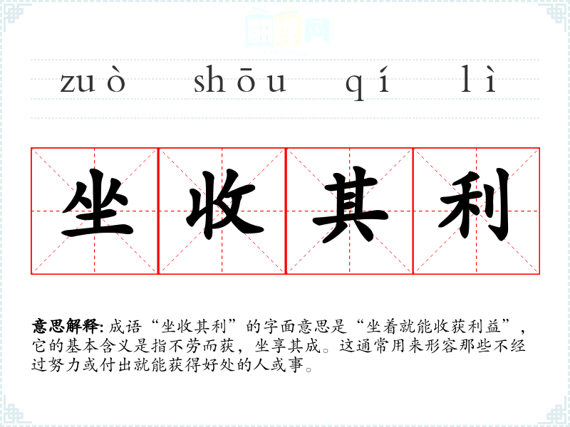 成语“坐收其利”的字面意思是“坐着就能收获利益”,它的基本含义是指不劳而获,坐享其成。这通常用来形容那些不经过努力或付出就能获得好处的人或事。