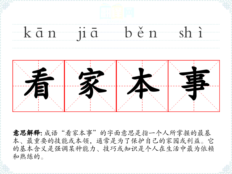 成语“看家本事”的字面意思是指一个人所掌握的最基本、最重要的技能或本领,通常是为了保护自己的家园或利益。它的基本含义是强调某种能力、技巧或知识是个人在生活中最为依赖和熟练的。