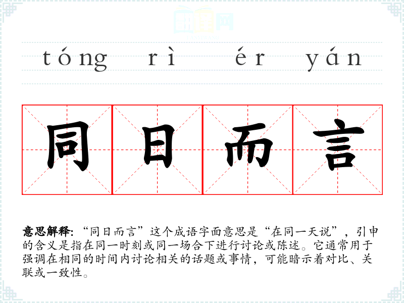 “同日而言”这个成语字面意思是“在同一天说”,引申的含义是指在同一时刻或同一场合下进行讨论或陈述。它通常用于强调在相同的时间内讨论相关的话题或事情,可能暗示着对比、关联或一致性。