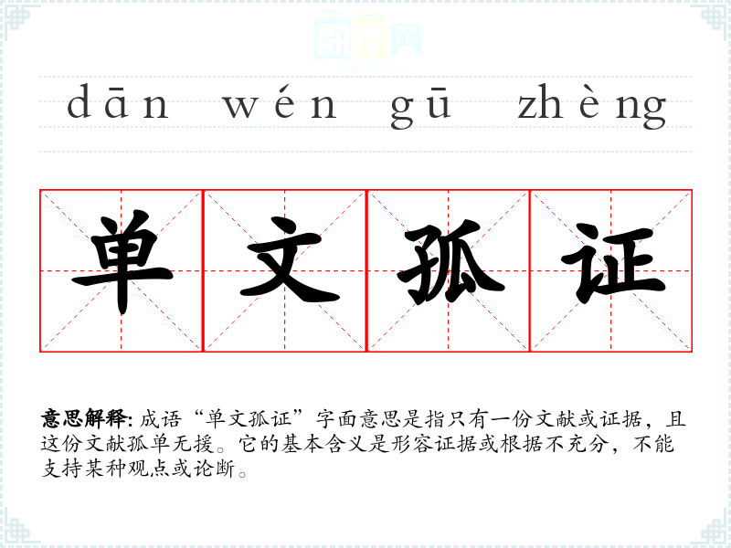 成语“单文孤证”字面意思是指只有一份文献或证据,且这份文献孤单无援。它的基本含义是形容证据或根据不充分,不能支持某种观点或论断。