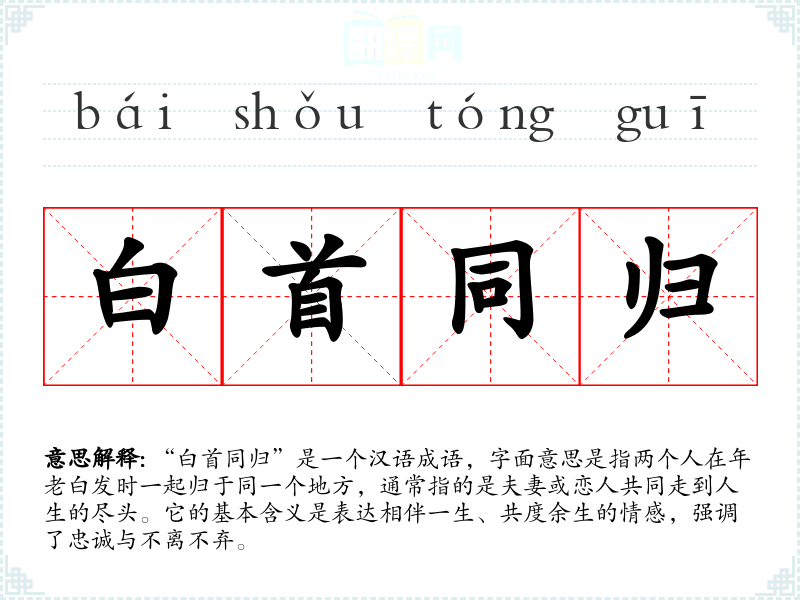 “白首同归”是一个汉语成语,字面意思是指两个人在年老白发时一起归于同一个地方,通常指的是夫妻或恋人共同走到人生的尽头。它的基本含义是表达相伴一生、共度余生的情感,强调了忠诚与不离不弃。