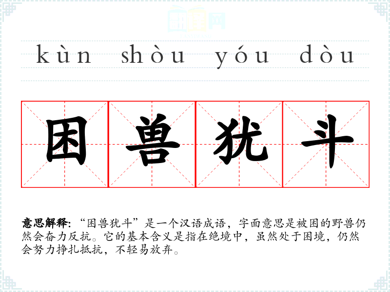 “困兽犹斗”是一个汉语成语,字面意思是被困的野兽仍然会奋力反抗。它的基本含义是指在绝境中,虽然处于困境,仍然会努力挣扎抵抗,不轻易放弃。