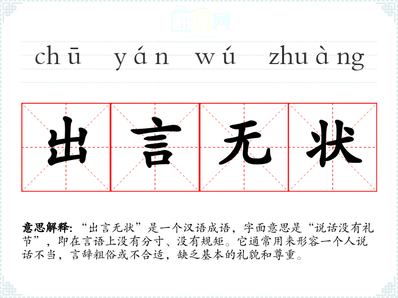 “出言无状”是一个汉语成语,字面意思是“说话没有礼节”,即在言语上没有分寸、没有规矩。它通常用来形容一个人说话不当,言辞粗俗或不合适,缺乏基本的礼貌和尊重。