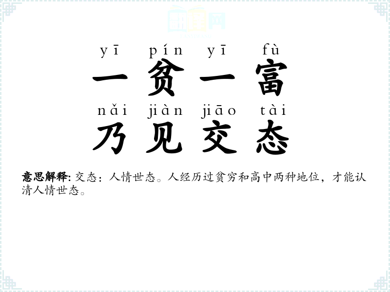 交态:人情世态。人经历过贫穷和高中两种地位,才能认清人情世态。 |