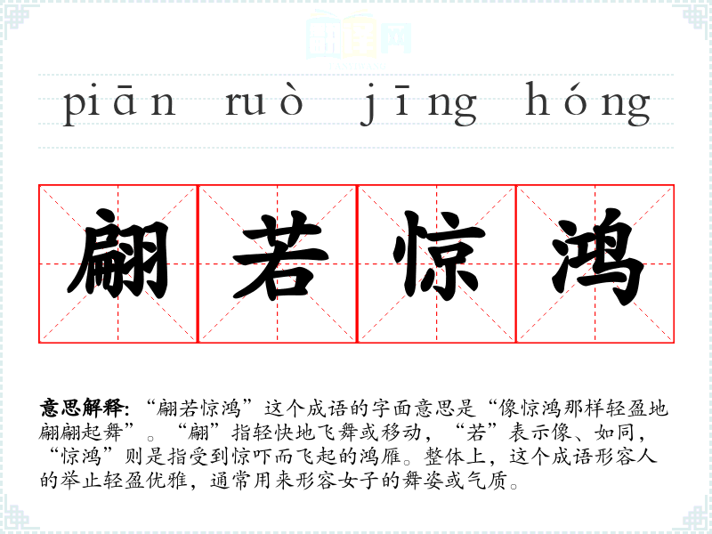 “翩若惊鸿”这个成语的字面意思是“像惊鸿那样轻盈地翩翩起舞”。“翩”指轻快地飞舞或移动,“若”表示像、如同,“惊鸿”则是指受到惊吓而飞起的鸿雁。整体上,这个成语形容人的举止轻盈优雅,通常用来形容女子的舞姿或气质。