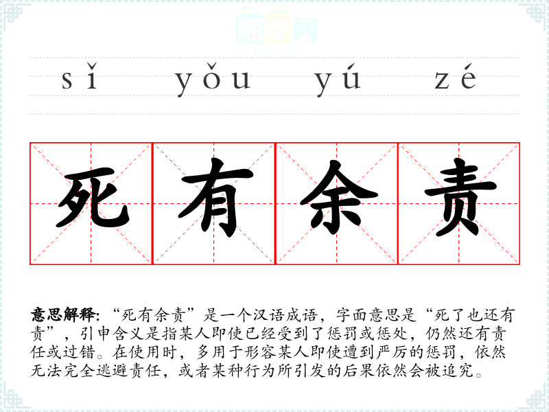 “死有余责”是一个汉语成语,字面意思是“死了也还有责”,引申含义是指某人即使已经受到了惩罚或惩处,仍然还有责任或过错。在使用时,多用于形容某人即使遭到严厉的惩罚,依然无法完全逃避责任,或者某种行为所引发的后果依然会被追究。