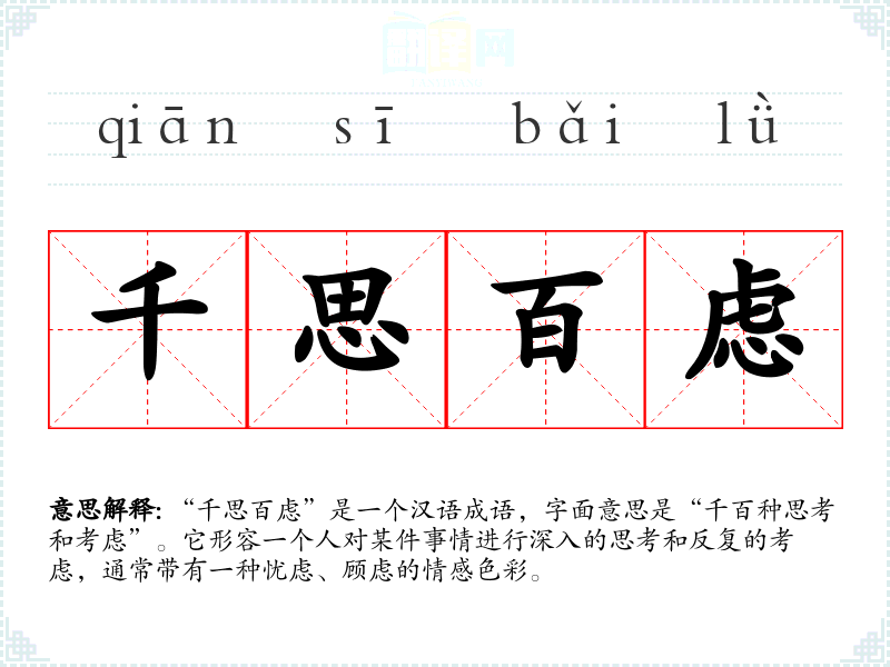 “千思百虑”是一个汉语成语,字面意思是“千百种思考和考虑”。它形容一个人对某件事情进行深入的思考和反复的考虑,通常带有一种忧虑、顾虑的情感色彩。