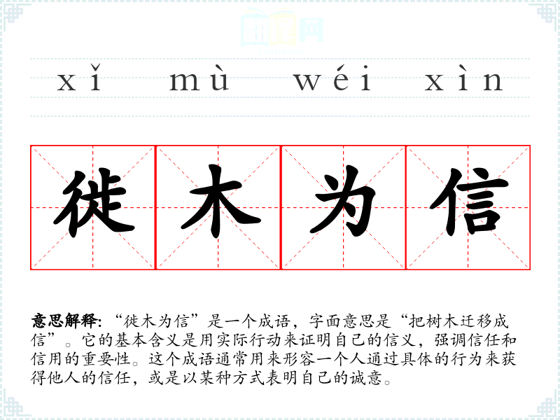 | 徙木为信 | 徙:迁移;信:信用。指说到做到,言而有信。 |
