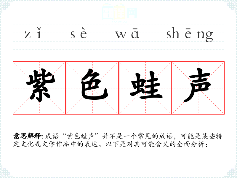 成语“紫色蛙声”并不是一个常见的成语,可能是某些特定文化或文学作品中的表达。以下是对其可能含义的全面分析: