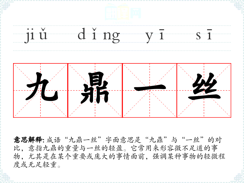 “九鼎”源自古代**的九鼎,鼎是一种重要的礼器,象征权力和地位,九鼎在古代被视为极其重要的象征。而“一丝”则表示微小的事物。这个成语的具体来源并不明确,但其概念可以追溯到对比和夸张的文学表现形式,反映了古人对事物轻重的看法。