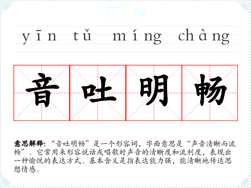 “音吐明畅”并没有特定的历史典故或文学出处,而是由“音”、“吐”、“明”、“畅”四个字组合而成。每个字都有其独特的含义: