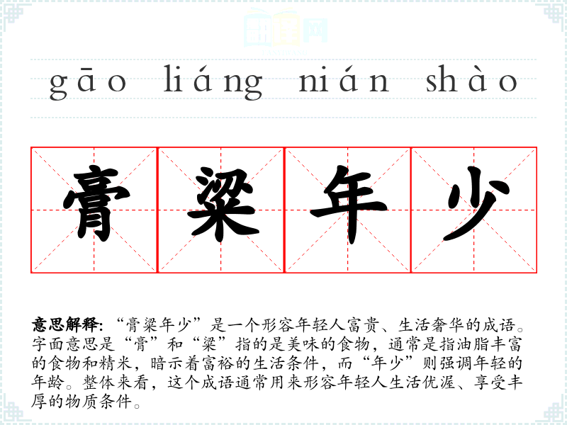 “膏粱年少”是一个形容年轻人富贵、生活奢华的成语。字面意思是“膏”和“粱”指的是美味的食物,通常是指油脂丰富的食物和精米,暗示着富裕的生活条件,而“年少”则强调年轻的年龄。整体来看,这个成语通常用来形容年轻人生活优渥、享受丰厚的物质条件。