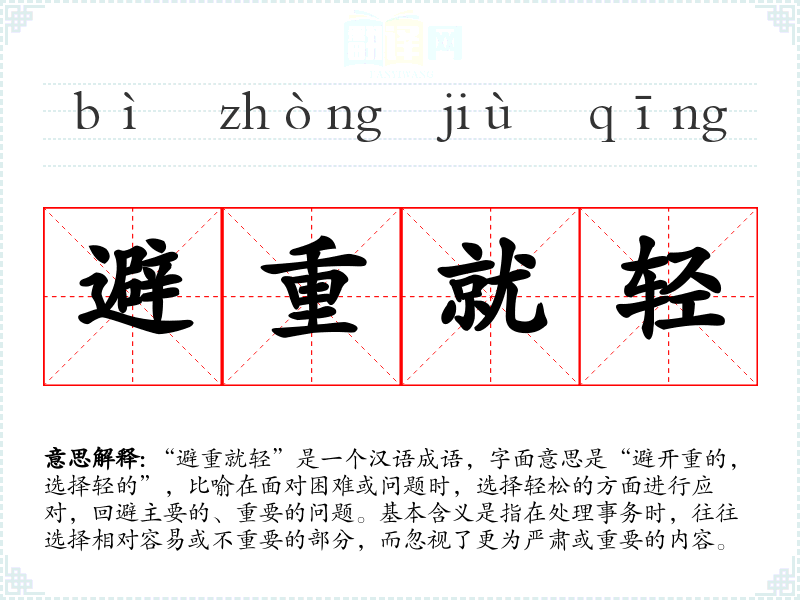 “避重就轻”是一个汉语成语,字面意思是“避开重的,选择轻的”,比喻在面对困难或问题时,选择轻松的方面进行应对,回避主要的、重要的问题。基本含义是指在处理事务时,往往选择相对容易或不重要的部分,而忽视了更为严肃或重要的内容。