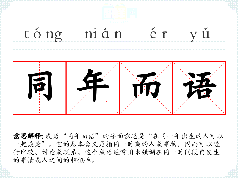 成语“同年而语”的字面意思是“在同一年出生的人可以一起谈论”。它的基本含义是指同一时期的人或事物,因而可以进行比较、讨论或联系。这个成语通常用来强调在同一时间段内发生的事情或人之间的相似性。