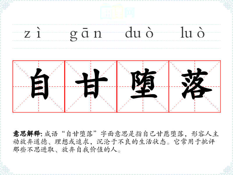 成语“自甘堕落”字面意思是指自己甘愿堕落,形容人主动放弃道德、理想或追求,沉沦于不良的生活状态。它常用于批评那些不思进取、放弃自我价值的人。
