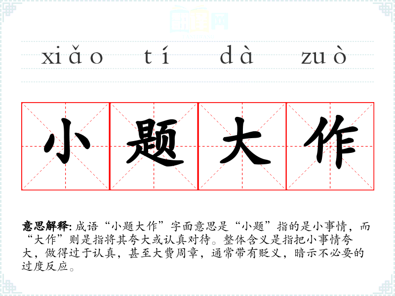 成语“小题大作”字面意思是“小题”指的是小事情,而“大作”则是指将其夸大或认真对待。整体含义是指把小事情夸大,做得过于认真,甚至大费周章,通常带有贬义,暗示不必要的过度反应。