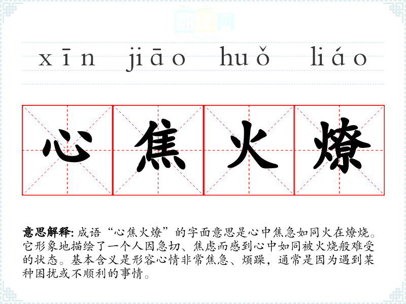 在英语中,类似于“心焦火燎”的表达有“burning with anxiety”或“on pins and needles”,都传达了急切和不安的情感。虽然不同文化有不同的表达方式,但焦虑和烦躁的情绪是普遍存在的。