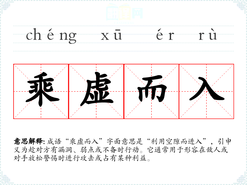 成语“乘虚而入”字面意思是“利用空隙而进入”,引申义为趁对方有漏洞、弱点或不备时行动。它通常用于形容在敌人或对手放松警惕时进行攻击或占有某种利益。