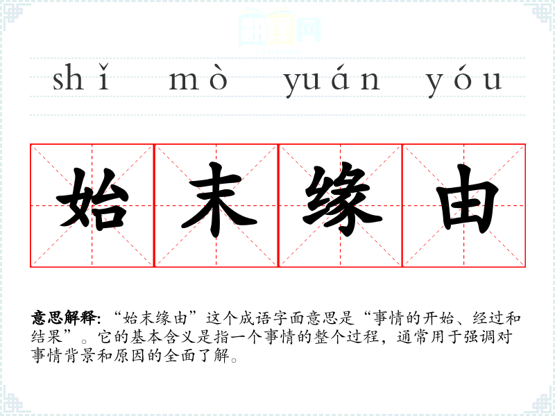 “始末缘由”这个成语字面意思是“事情的开始、经过和结果”。它的基本含义是指一个事情的整个过程,通常用于强调对事情背景和原因的全面了解。