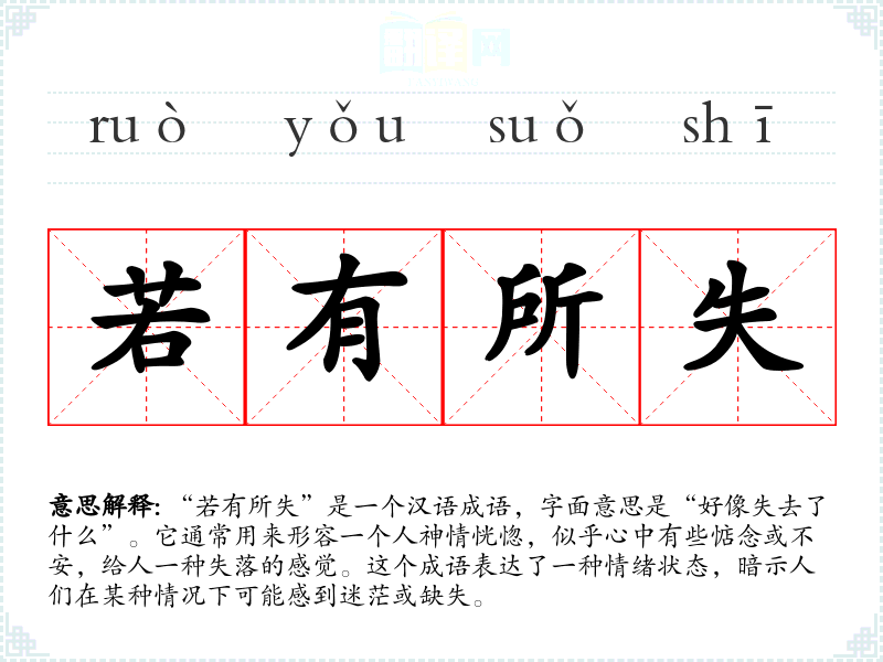 “若有所失”是一个汉语成语,字面意思是“好像失去了什么”。它通常用来形容一个人神情恍惚,似乎心中有些惦念或不安,给人一种失落的感觉。这个成语表达了一种情绪状态,暗示人们在某种情况下可能感到迷茫或缺失。