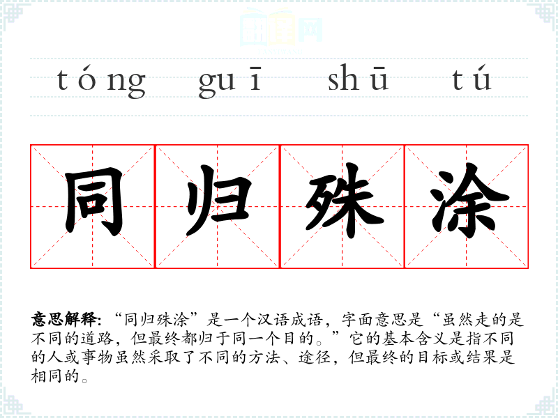 | 同归殊涂 | 原指天下万事初虽异,然终究同归于一。后泛指途径不同而结果相同。 |