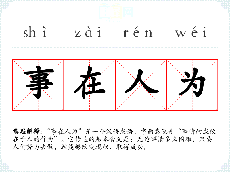 “事在人为”是一个汉语成语,字面意思是“事情的成败在于人的作为”。它传达的基本含义是:无论事情多么困难,只要人们努力去做,就能够改变现状,取得成功。