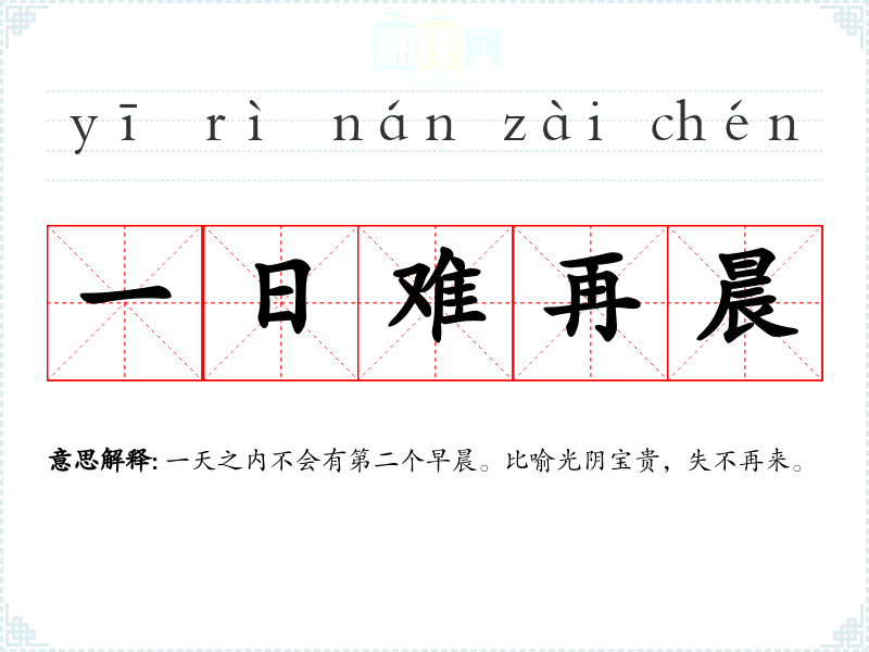 | 一日难再晨 | 一天之内不会有第二个早晨。比喻光阴宝贵,失不再来。 |