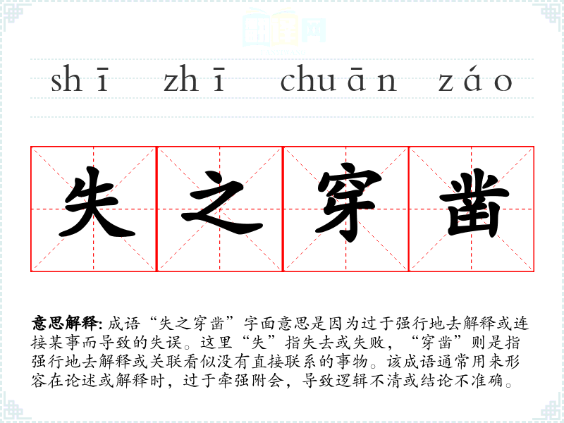 成语“失之穿凿”字面意思是因为过于强行地去解释或连接某事而导致的失误。这里“失”指失去或失败,“穿凿”则是指强行地去解释或关联看似没有直接联系的事物。该成语通常用来形容在论述或解释时,过于牵强附会,导致逻辑不清或结论不准确。