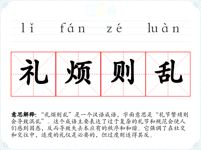 “礼烦则乱”是一个汉语成语,字面意思是“礼节繁琐则会导致混乱”。这个成语主要表达了过于复杂的礼节和规范会使人们感到困惑,反而导致失去本应有的秩序和和谐。它强调了在社交和交往中,适度的礼仪是必要的,但过度则适得其反。