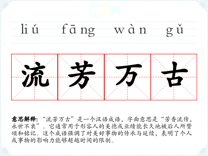 | 万古流芳 | 芳:香,指美名。好名声永远流传。 |