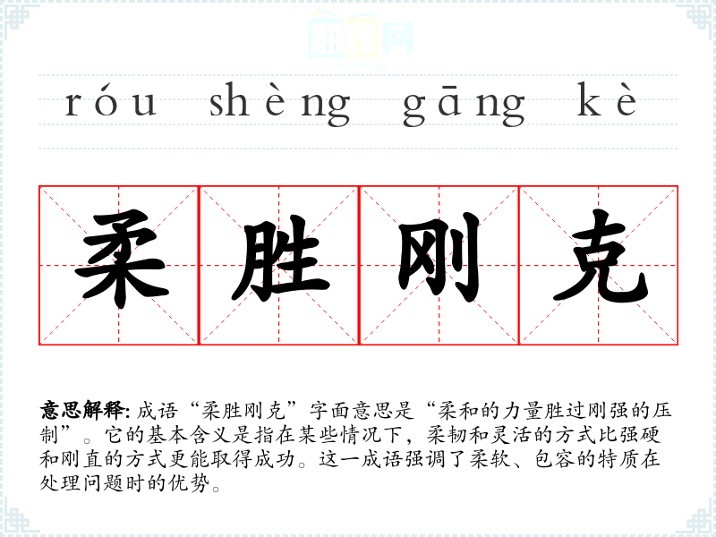 成语“柔胜刚克”字面意思是“柔和的力量胜过刚强的压制”。它的基本含义是指在某些情况下,柔韧和灵活的方式比强硬和刚直的方式更能取得成功。这一成语强调了柔软、包容的特质在处理问题时的优势。