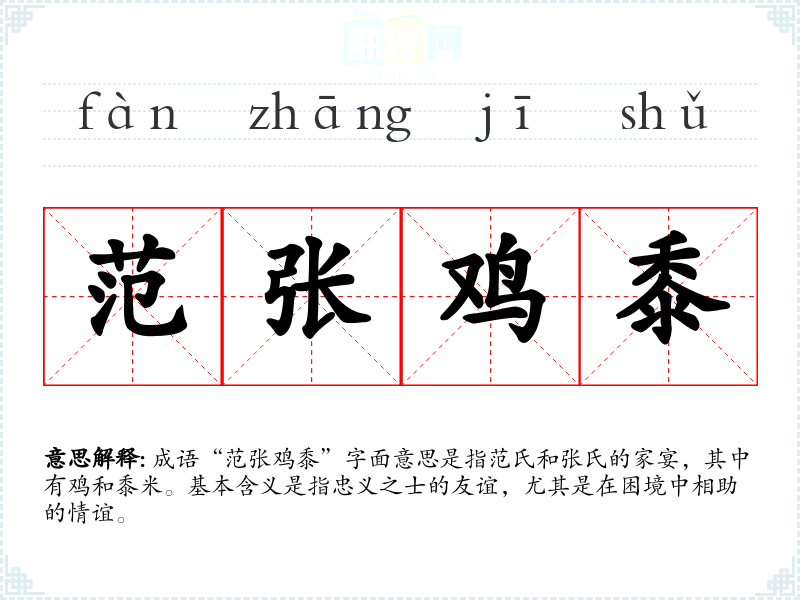成语“范张鸡黍”字面意思是指范氏和张氏的家宴,其中有鸡和黍米。基本含义是指忠义之士的友谊,尤其是在困境中相助的情谊。