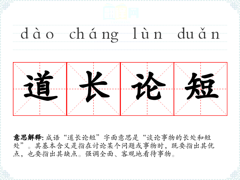 成语“道长论短”字面意思是“谈论事物的长处和短处”。其基本含义是指在讨论某个问题或事物时,既要指出其优点,也要指出其缺点。强调全面、客观地看待事物。