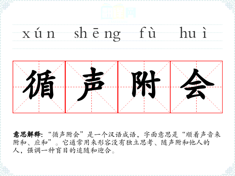 “循声附会”是一个汉语成语,字面意思是“顺着声音来附和、应和”。它通常用来形容没有独立思考、随声附和他人的人,强调一种盲目的追随和迎合。